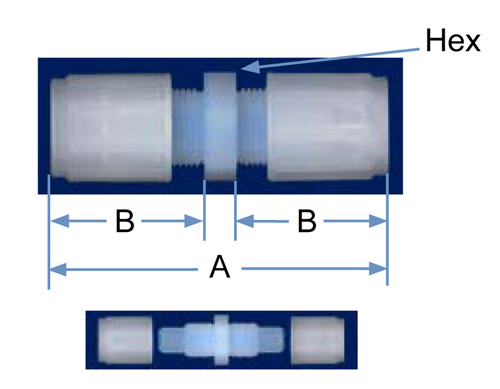 | Straight Union PFA Part No. | TubeO.D. | Orifice | A | B | Hex |