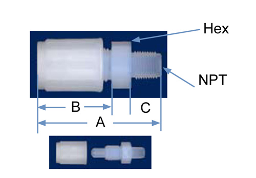 | Male Connector PFA Part No. | Tube O.D. | NPT Size | Orifice | A | B | C | Hex |